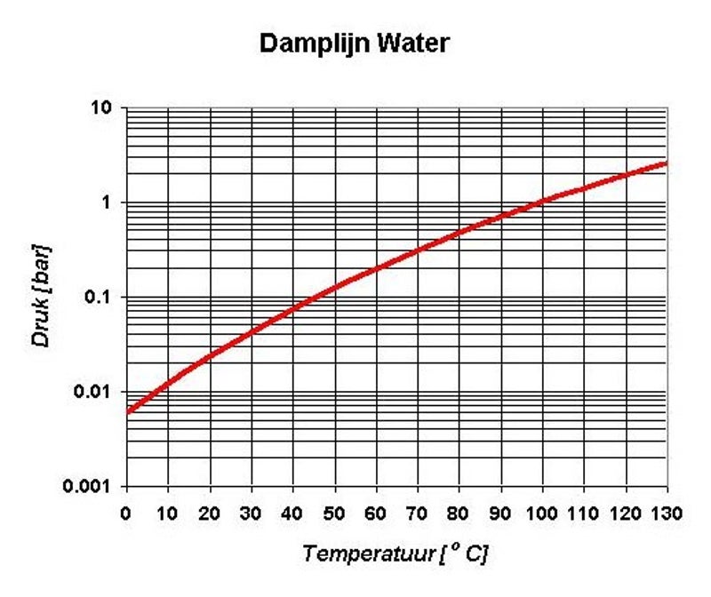De temperatuur waarbij een vloeistof kookt is afhankelijk van de heersende druk. Bij 1 atmosfeer of 1 bar (luchtdruk op zeeniveau, 101,135 kPa) is het kookpunt van water 100 °C, of eigenlijk, meer precies: 99,97 °C. Op de Mount Everest waar de luchtdruk ongeveer 0,4 bar is, is het kookpunt van water slechts 70 °C. En in een hogedrukpan kookt het water bij 120 °C. en 2 bar.(zie onderstaande grafiek)De damplijn die de dampdruk uitzet tegen de temperatuur laat zien bij welke druk welk kookpunt hoort. Hieronder is de damplijn voor water weergegeven.